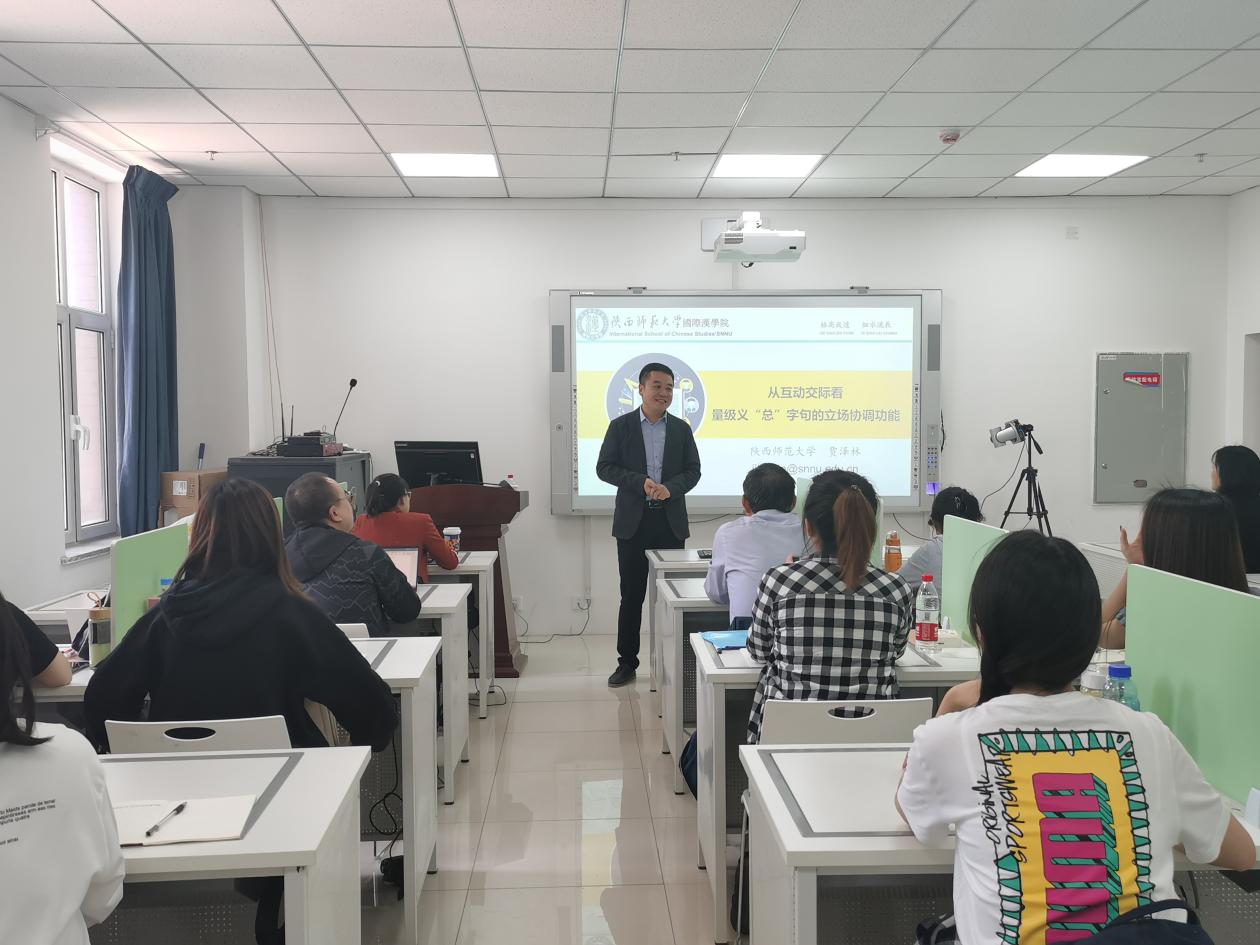 524日,应学院邀请,在文科实训楼404教室,贾泽林副教授来院做了题为《“从互动交际看量级义“总”字句的立场协调功能》的学术讲座。讲座由王晶老师主持,学院师生40余人参加。