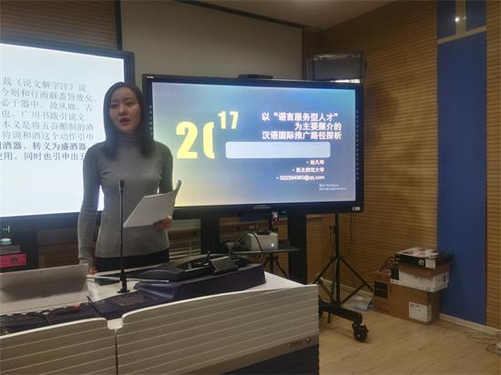 徐凡棽同学以《以“语言服务型人才”为主要媒介的汉语国际教育推广路径探析》为题做了学术汇报,她基于传播学、语言学以及跨文化交际的视角,分析了在“一带一路”倡议下的汉语对外传播路径,尤其是以“语言人才”为主要传播媒介。