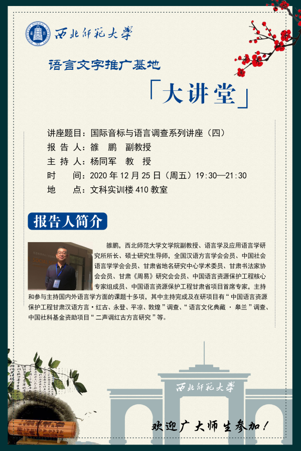 据悉,雒鹏副教授主持和参与主持国内外语言学方面的课题十多项,其中主持完成及在研项目有“中国语言资源保护工程甘肃汉语方言•红古、永登、平凉、敦煌”调查、“语言文化典藏·皋兰”调查、中国社科基金资助项目“二声调红古方言研究”等。本次系列讲座也是我校省级语言文字推广基地“大讲堂”重要学术讲座安排之一。