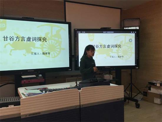 2017级汉硕魏紫燕的报告《甘谷方言虚词探究》中,以甘谷方言虚词和现代普通话对比为例,汇报了甘谷方言从古至今虚词音变的特点。