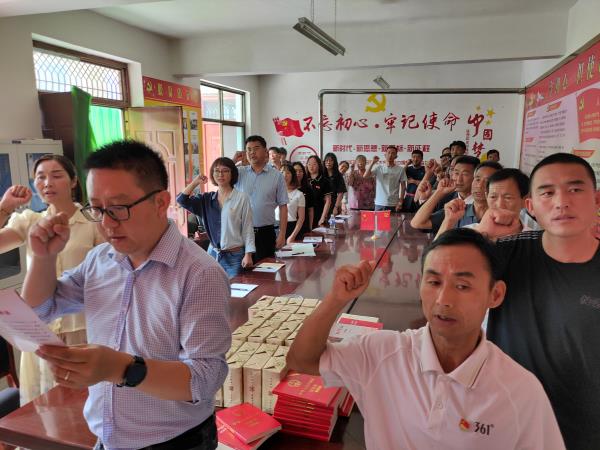 据村长介绍,蒲陈村党龄最小的党员也已35岁,在大学生党员面前也是一位“年轻的老同志”。牛定炜同志随后带领全体党员重温入党誓词。面对鲜艳的党旗,隔着不小的年龄差,在座的党员都坚定地举起了右手,铿锵有力地说出入党誓词,一声“永不叛党!”更是将老党员们的对党的忠诚与年轻党员们的一腔热血淋漓尽致地展现了出来!新老党员每个人脸上都写满了庄重与严肃,“老带新”的场面十分感人。